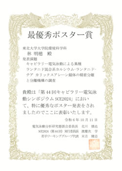 2024/10/16 壹岐研究室 M1 林明穂さん,SCE2024 最優秀ポスター賞受賞 受賞題目 キャピラリー電気泳動による異種ランタニド混合系カルシウム-ランタニド-チアカリックスアレーン錯体の精密分離と分離機構の調査 受賞者 林明穂 連名 唐島田龍之介,澤村瞭太,壹岐伸彦 受賞名 最優秀ポスター賞 学会名 第44回キャピラリー電気泳動シンポジウム(SCE2024) 受賞日 2024年10月11日 研究室HP 環境分析化学分野 壹岐研究室
