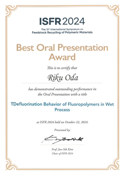 2024/10/29 吉岡研究室 M2 小田陸さん,ISFR 2024 Best Oral Presentation Award 受賞 受賞題目 Defluorination Behavior of Fluoropolymers in Wet Process 受賞者 小田陸 受賞名 Best Oral Presentation Award 学会名 The 12th International Symposium on Feedstock Recycling of Polymeric Materials(ISFR 2024) 受賞日 2024年10月22日 研究室HP 資源再生プロセス学分野 吉岡研究室