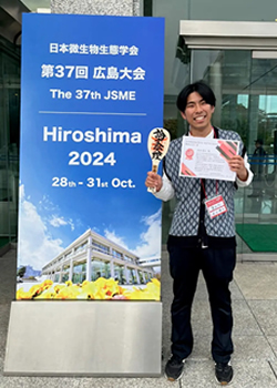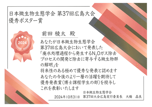2024/11/05 久保田研究室 D1 前田稜太さん,日本微生物生態学会 第37回広島大会 優秀ポスター賞(博士課程学生の部)受賞 受賞題目 廃水処理過程から発生するN2Oガス除去プロセスの開発と除去に寄与する微生物群の解明 受賞者 前田稜太 連名 佐藤幹子,南澤究,久保田健吾 受賞名 優秀ポスター賞(博士課程学生の部) 学会名 日本微生物生態学会 第37回広島大会 受賞日 2024年10月31日 研究室HP 水資源システム学分野 久保田研究室