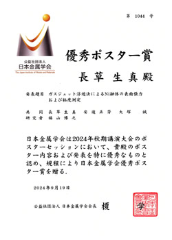 2024/11/08 福山研究室 M1 長草生真さん,日本金属学会2024年秋期 優秀ポスター賞受賞 受賞題目 ガスジェット浮遊法によるNi融体の表面張力および粘度測定 受賞者 長草生真 連名 安達正芳,大塚誠,福山博之 受賞名 日本金属学会2024年秋期 優秀ポスター賞 学会名 (公社)日本金属学会 受賞日 2024年09月19日 研究室HP 高温材料物理化学分野 福山研究室