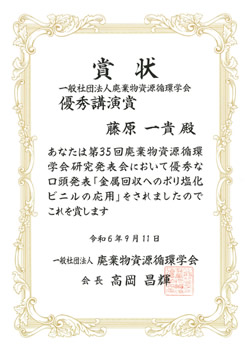 2024/11/13 吉岡研究室 M1 藤原一貴さん,第35回廃棄物資源循環学会研究発表会 優秀講演賞受賞 受賞題目 金属回収へのポリ塩化ビニルの応用 受賞者 藤原一貴 受賞名 優秀講演賞 学会名 第35回廃棄物資源循環学会研究発表会 受賞日 2024年9月11日 研究室HP 資源再生プロセス学分野 吉岡研究室