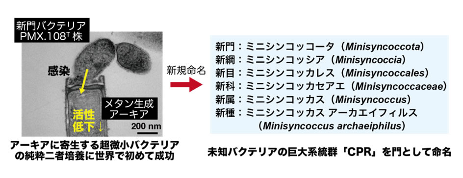 さらに、「ミニシンコッカス アーカエイフィルス」が属する未知バクテリア巨大系統群である「Candidate phyla radiation (CPR) 注1 」を新門「ミニシンコッコータ(Minisyncoccota)」と命名しました。