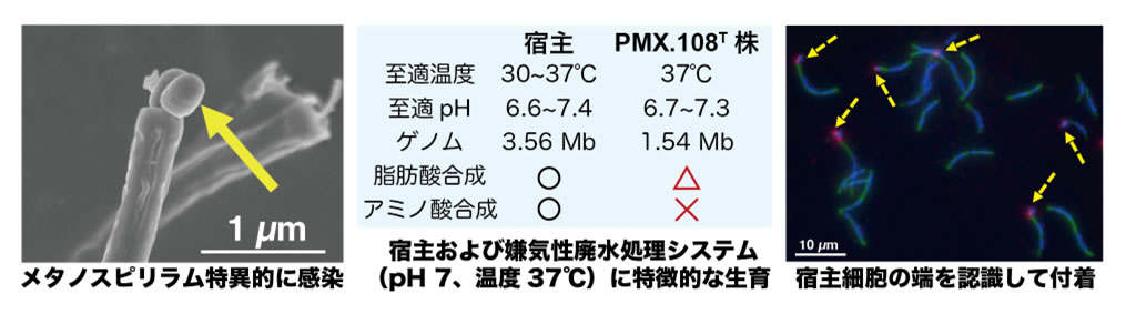図1. (左)PMX.108T株と宿主アーキア「メタノスピリラム ヒュンゲッティ JF-1T株」の電子顕微鏡写真、(中央)至適生育範囲やゲノム情報の比較、(右)蛍光顕微鏡写真(青:微生物のDNAを染色、ピンク:PMX.108TのRNAを染色、緑:メタノスピリラムのRNAを染色)