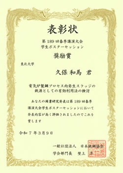 2025/03/18 村上研究室 B4 久保和馬さん,日本鉄鋼協会2025年春季講演大会「学生ポスターセッション奨励賞」受賞 受賞題目 電気炉製鋼プロセス内発生スラッジの鉄源としての有効利用法の検討 受賞者 久保和馬 受賞名 学生ポスターセッション奨励賞 学会名 日本鉄鋼協会2025年春季講演大会 受賞日 2025年03月09日 研究室HP 資源利用プロセス学分野 村上研究室