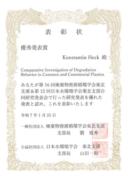 2025/03/27 吉岡研究室 M2 Konstantin Heckさん,第16回廃棄物資源循環学会東北支部 & 第12回日本水環境学会東北支部合同研究発表会「優秀発表賞」受賞
