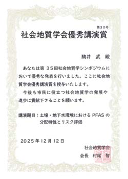 2026/01/08 駒井武名誉教授,第35回社会地質学シンポジウム「社会地質学会優秀講演賞」受賞 受賞題目 土壌・地下水環境におけるPFASの分配特性とリスク評価 受賞者 駒井武 受賞名 社会地質学会優秀講演賞 学会名 社会地質学会 受賞日 2025年12月12日