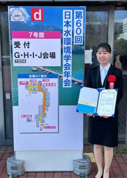 2026/03/12 久保田研究室 M2 溝渕和さん,第60回日本水環境学会年会「年会優秀発表賞(クリタ賞)」受賞 受賞題目 メタンの発生を抑制した高速一酸化二窒素除去プロセスの開発 受賞者 溝渕和 連名 前田稜太,佐藤幹子,南澤究,久保田健吾 受賞名 年会優秀発表賞(クリタ賞) 学会名 日本水環境学会 受賞日 2026年3月10日 研究室HP 水資源システム学分野 久保田研究室