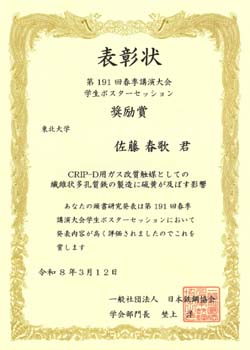 2026/03/25 村上研究室 M2 佐藤春歌さん,日本鉄鋼協会 第191回春季講演大会「学生ポスターセッション奨励賞」受賞 受賞題目 CRIP-D用ガス改質触媒としての繊維状多孔質鉄の製造に硫黄が及ぼす影響 受賞者 佐藤春歌 受賞名 学生ポスターセッション奨励賞 学会名 日本鉄鋼協会 第191回春季講演大会 受賞日 2026年03月12日 研究室HP 資源利用プロセス学分野 村上研究室