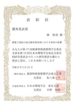 2026/03/25 吉岡研究室 M1 林怜奈さん,第17回 廃棄物資源循環学会東北支部 & 第13回 日本水環境学会東北支部 合同研究発表会「優秀発表賞」受賞 受賞題目 廃電子基板の湿式脱臭素処理における粒径の影響 受賞者 林怜奈 受賞名 優秀発表賞 学会名 第17回 廃棄物資源循環学会東北支部 & 第13回 日本水環境学会東北支部 合同研究発表会 受賞日 2026年02月21日 研究室HP 資源再生プロセス学分野 吉岡研究室