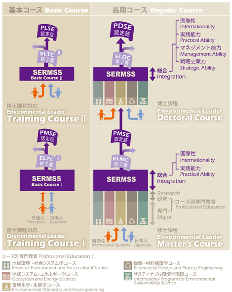 基本コースはI(長期コースの修士課程に対応)とII(長期コースの博士課程に対応)の2種類があります。 基本コースでは、国際性、実践能力、マネージメント能力、戦略立案力といった総合力の教育を行い、修了後は環境リーダー修了証明書(Certificate of International Environmental Leadership: Environmental Leader Training Certificate,ELTC)を授与します。 特に優秀な成績が認められるものは、基本コースI修了者にはPMSE(Professional Master for Sustainable Environment)として、基本コースII修了者にはPLSE(Professional Leader for Sustainable Environment)として認定を行います。
