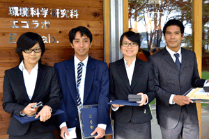 この日行われた研究科学位記伝達式にて、環境リーダー長期コース修士課程の4名が環境リーダーマスター修了証書(ELMC)を受け取りました。また、その中より1名に、サステナブル環境マスター認定証(PMSE)が授与されました。